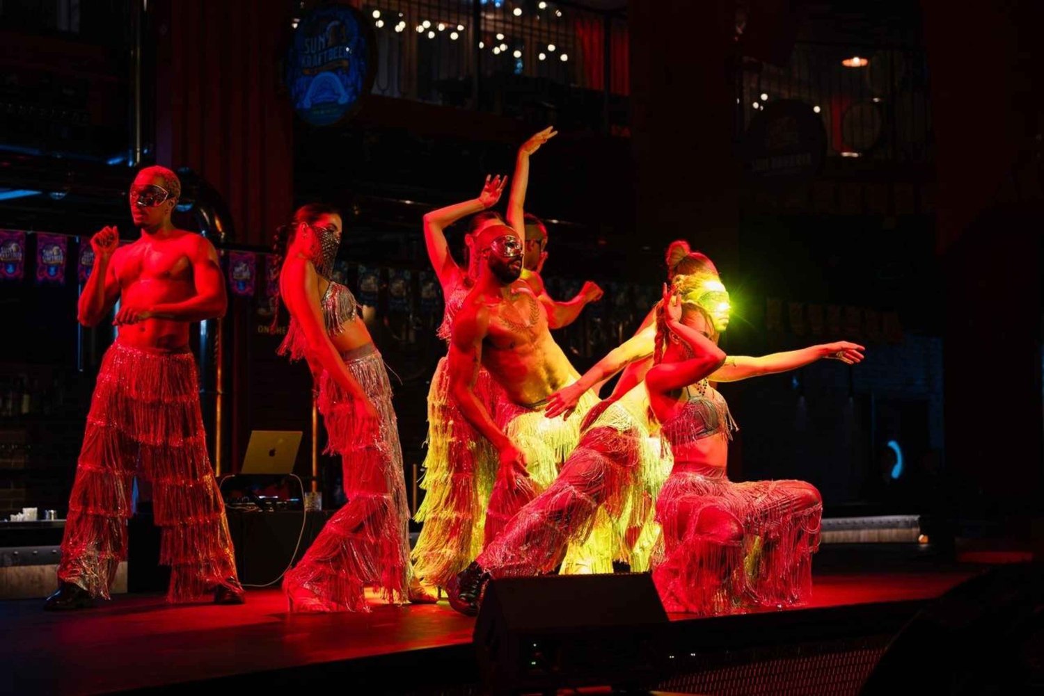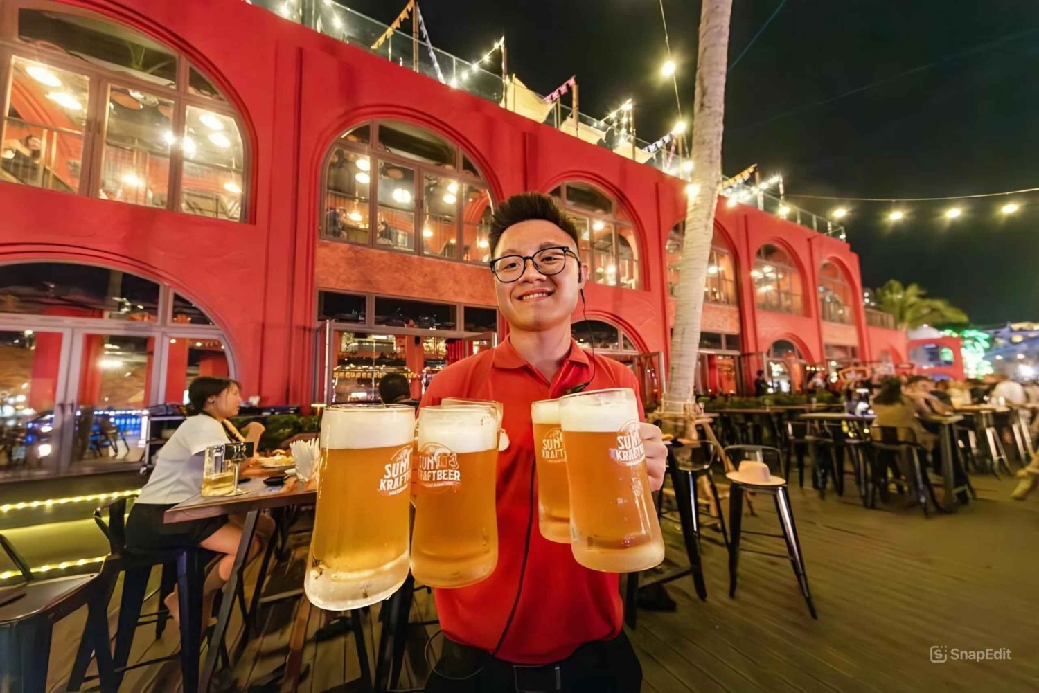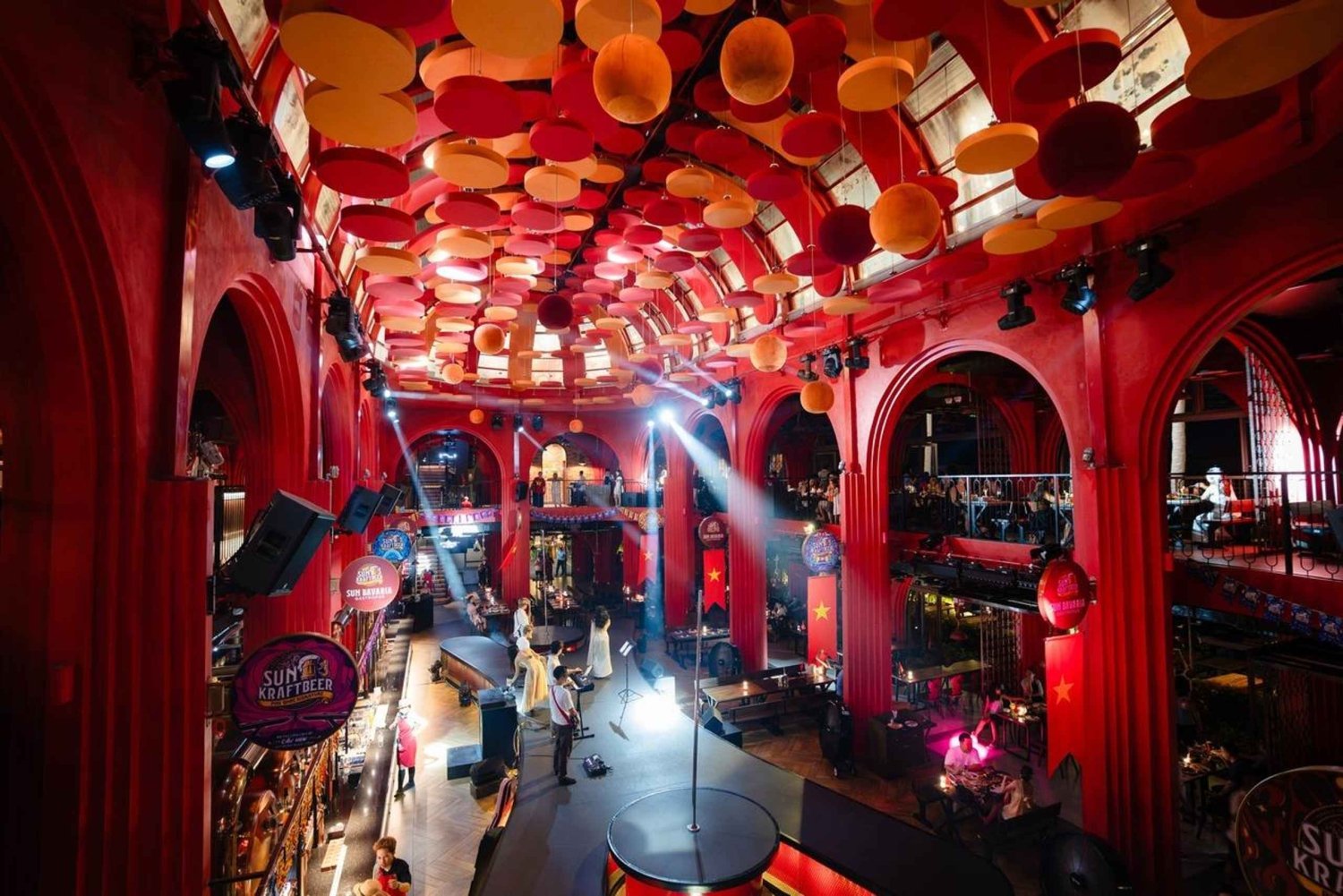 ⏰ 19:00 – Hotelafhentning og varm velkomst Når solens sidste gyldne stråler forsvinder i horisonten, henter vores bil dig på dit hotel og kører dig til den fortryllende Sun Bavaria GastroPub Så snart du ankommer, bliver du budt velkommen med en forfriskende velkomstdrink og den varme glød fra lanterner, rustik træindretning og den muntre stemning fra rejsende fra hele verden Det er begyndelsen på en aften, hvor hvert sekund føles som en scene fra en romantisk film. Par deler genert smil, venner skåler for eventyr, og alle mærker, at de er ved at opleve et minde, der er værd at huske for evigt 19.00 – 19.45 | Gourmetmiddag på Sun Bavaria GastroPub Din aften begynder med en omhyggeligt udvalgt middag, der blander Phu Quocs sjæl med international kulinarisk kunst Kreative fusionsretter, der er anrettet som kunstværker Hver ret er perfekt parret med håndbrygget øl. Smagen er mere end mad – den fortæller historien om øen, hvor hav, kultur og lidenskab mødes på din tallerken Stemningen er sprudlende med latter og klirrende glas, men stadig intim – den perfekte baggrund for hviskede samtaler, blide blikke og fælles skåle under lysets ravfarvede glød. 19:45 – 20:15 | 'Symphony of the Sea' – Havets storslåede forestilling Mens din middag fortsætter, forvandles natten. Scenen vågner med Symphony of the Sea – en blændende forestilling, hvor selve havet bliver en del af showet Jetski'er suser hen over bølgerne som dansere på en flydende scene Musikken svulmer op og blander sig med de glitrende lys, der maler vandet i levende farver Fyrværkeri afbryder forestillingen og symboliserer lidenskab, kærlighed og havets utæmmede skønhed I det øjeblik står tiden stille. Gæsterne sidder fortryllede, og deres hjerter banker til rytmen af havets storslåede symfoni 20:15 – 21:00 | Musik, dans og fest Energien stiger derefter til et crescendo, når sangerne går på scenen med kraftfulde stemmer og dybfølte sange. Dansere hvirvler yndefuldt og fylder natten med farve og rytme Hver note, hvert trin inviterer dig til at være med – til at svinge blidt med din partner, til at klappe med venner, til at fordybe dig i festens glæde Det føles mindre som en forestilling og mere som en festival, et pulsslag på øen, der deles af alle tilstedeværende 21.00 - 21.30 | Fyrværkeri over havet Og så – den perfekte finale. Musikken bliver blødere, publikum bliver stille, og det mørke lærred af Phu Quoc-himlen antændes Fyrværkeri i stor højde blomstrer over hovedet, og deres refleksioner danser over havet som tusind stjerner Elskende holder hænder, familier omfavner hinanden, venner hæver glassene – alle kigger opad i ærefrygt Det er en scene af ren magi: havet skinner nedenunder, himlen står i brand ovenfor, og du står midt i det hele En afslutning, der ikke bare er spektakulær, men dybt romantisk og uforglemmelig – et minde, der for evigt er præget af lys og latter BEMÆRK: På denne tur kan du se havets kys-fyrværkerishow fra restaurantenIncludes
