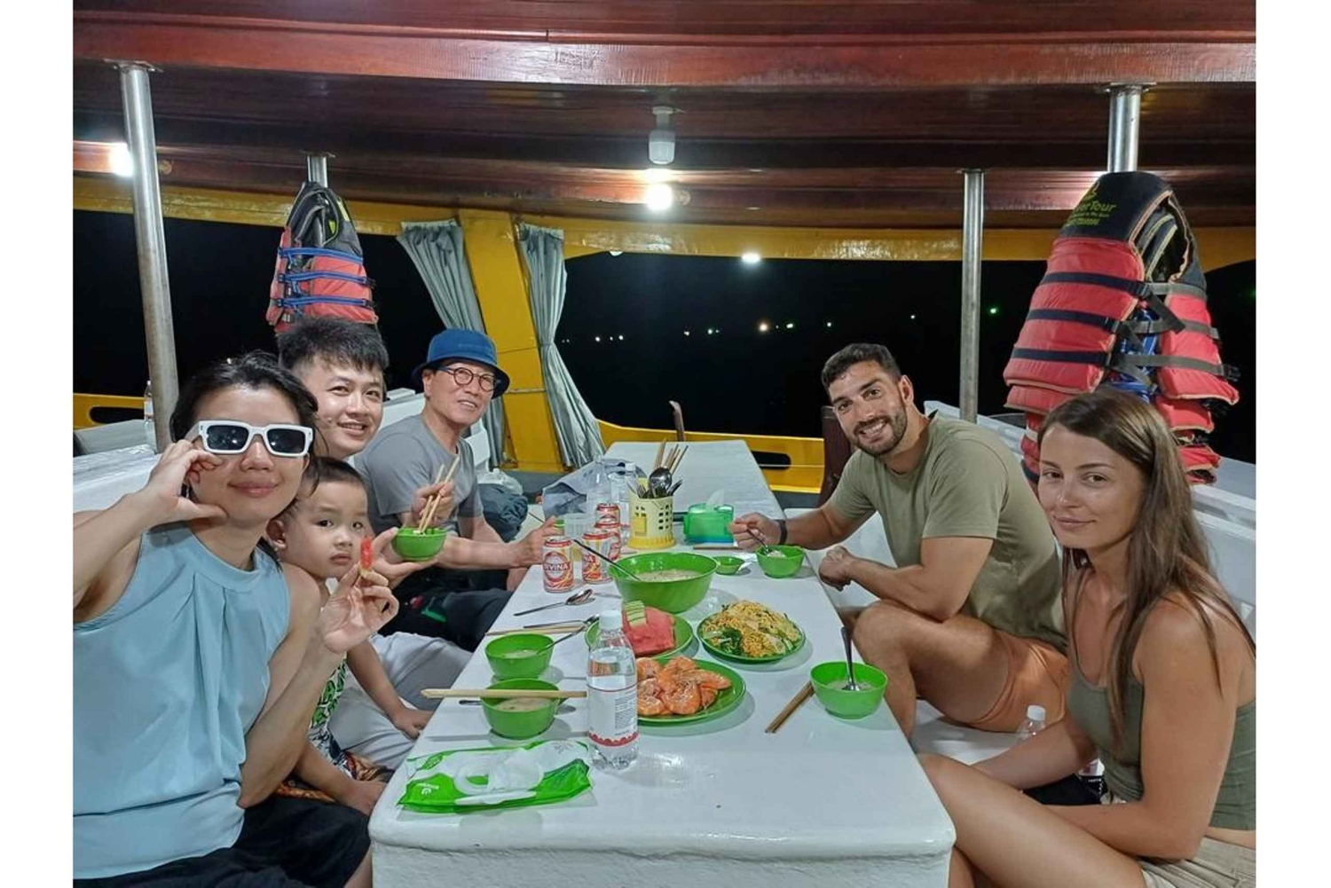- Genieße ein köstliches Abendessen an Bord eines traditionellen Holzbootes