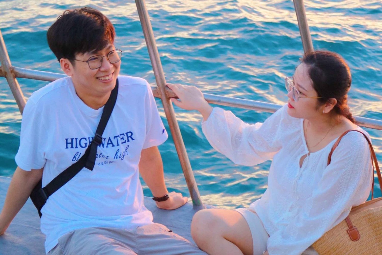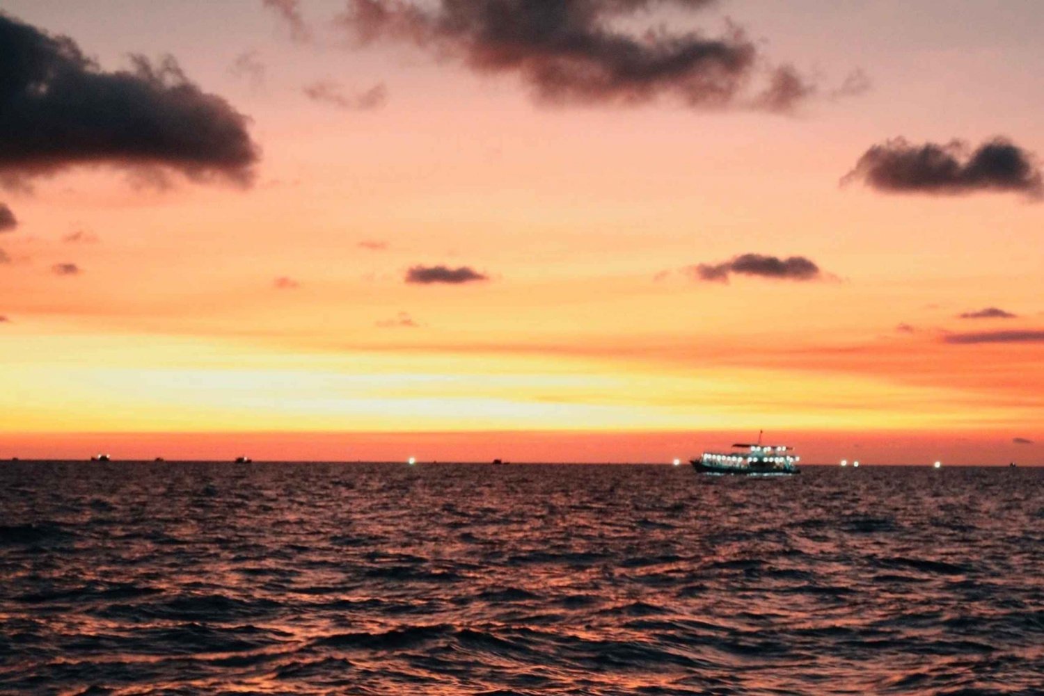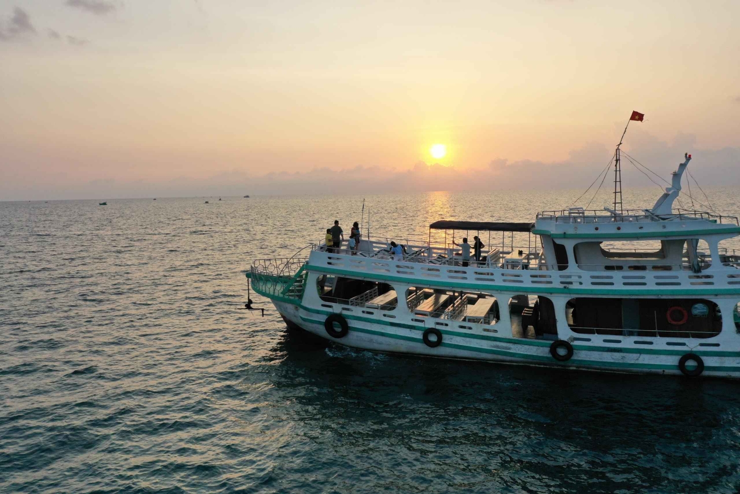 Disfrutar de la puesta de sol y la pesca nocturna de calamares es una de las actividades favoritas en Phu Quoc por la noche. Cuando el sol se ha puesto, es el mejor momento para disfrutar de la puesta de sol. El océano adquiere un color naranja oscuro y comienza la aventura. Es hora de vivir un momento emocionante con las actividades nocturnas de pesca de calamares. 05:00 pm Te recogerán en el hotel y comenzarás el viaje. ●Disfruta de la puesta de sol en medio del mar. ●Experimenta la pesca del calamar. ●Cena a bordo y disfruta del calamar fresco que has pescado. 09:00 pm Regreso al puerto de Bach Dang y traslado de vuelta a tu hotel. AVISO: El lugar de pesca puede trasladarse a An Thoi durante la temporada de lluvias (de abril a octubre). El tiempo en la época de lluvias puede estar nublado. MENÚ DE LA CENA 1 Gambas al vapor o calamares al vapor. 2 Gachas de calamar. 3 Fideos salteados. 4 Fruta fresca. Habrá un recargo por servicio de recogida y regreso fuera de la zona de Duong Dong, ¡contacta con nosotros para más información! ●Se aplicará un recargo del 20% si tu fecha de participación coincide con las fiestas públicas del Tet (28/01-02/02, 30/04-01/05, 02/09, 01/01), pagadero in situ. * Todos los recargos se pagan en efectivo directamente al conductor.Includes