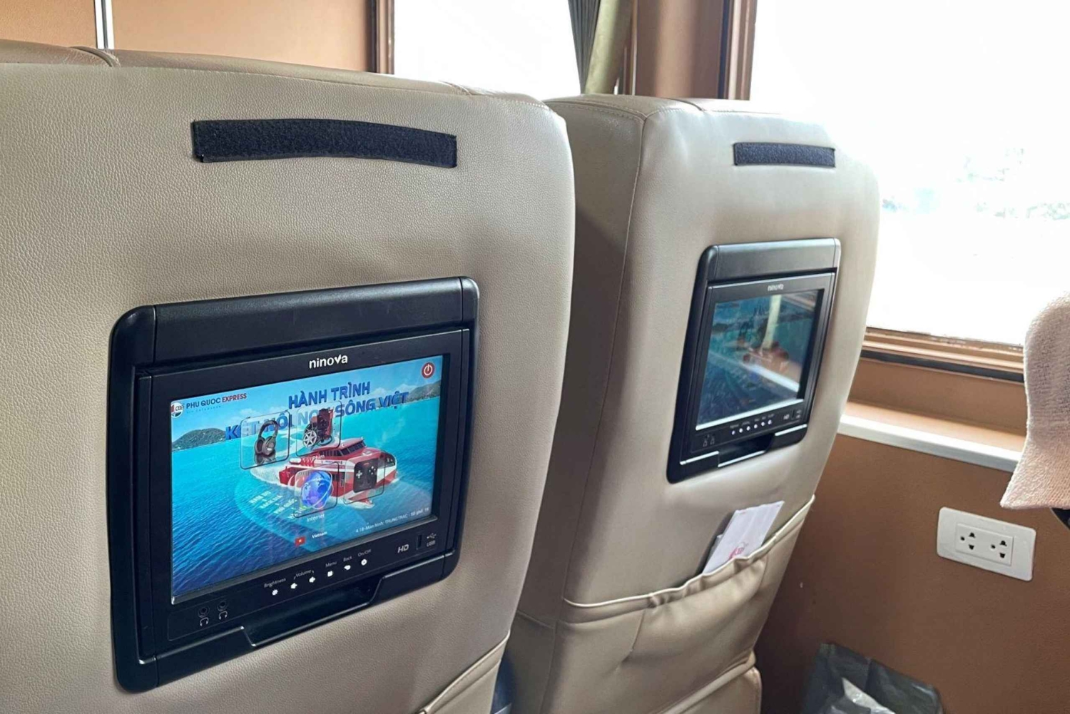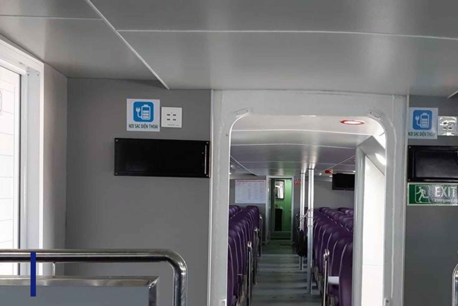 - DEPARTURE PORTS: Ha Tien Terminal ARRIVAL: Arrive 45-60 minutes before departure. Bai Vong Pier (Phu Quoc). WEATHER: 1.5-hour open sea crossing. Nov-Mar rough seas common. Check forecast before booking. SEASICKNESS: Open sea may cause motion sickness; consider medication. Reclining seats help. SEATING: Soft reclining coach seats with legroom. Upstairs seating is preferred for deck access. DECKS: Back deck open for photos (closed first/last 15-20 min & rough conditions). AC runs cold. ONBOARD: WiFi, USB chargers, TV, snack bar, toilets. Beverages/snacks available (free or paid). LUGGAGE: Reasonable space; bicycles/motorbikes not allowed. CAPACITY: 300 passengers. Book ahead for high season.