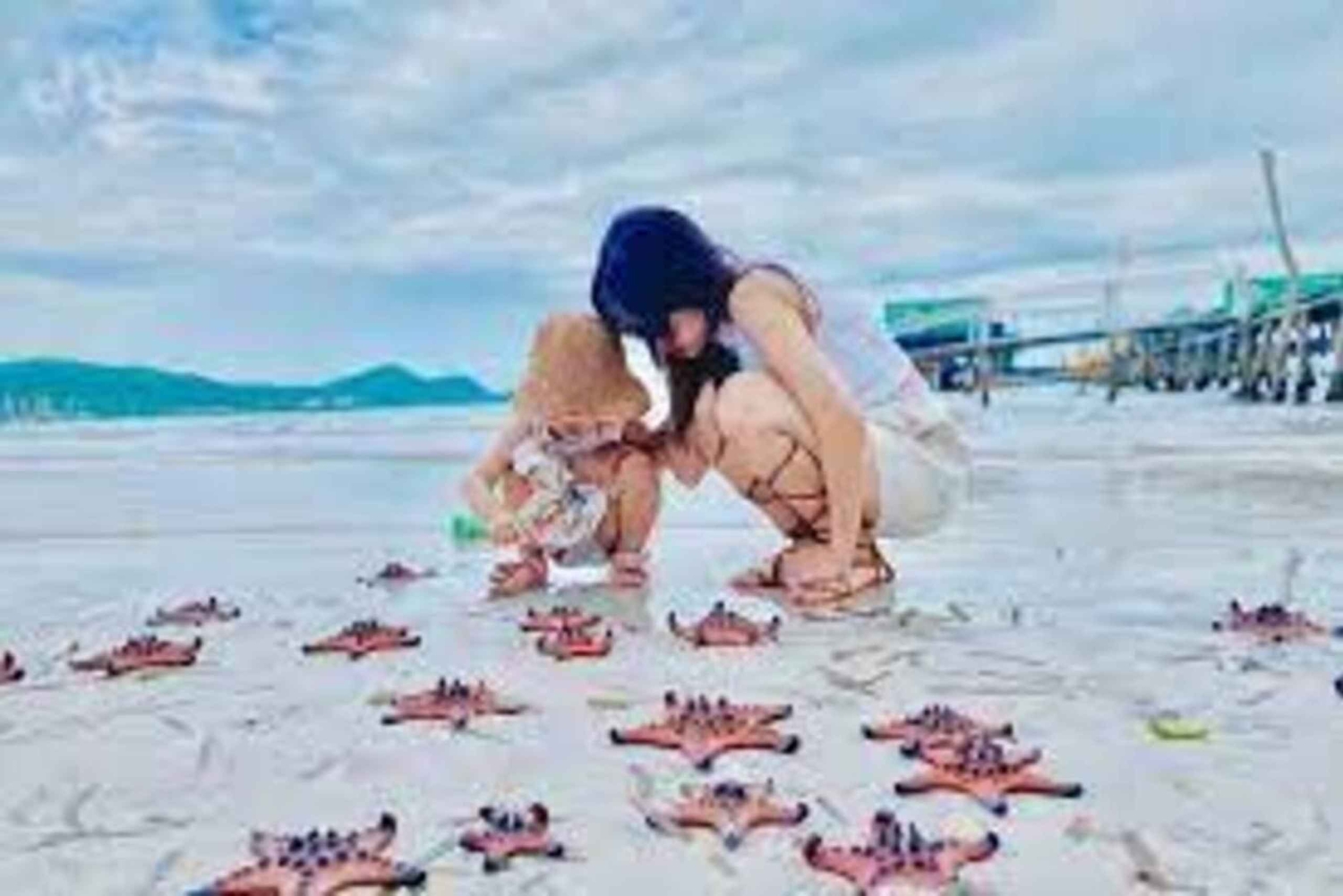 ● Le guide touristique viendra vous chercher à votre hôtel et vous partirez. ● La première destination est la rivière Cua Can : découvrez la sérénité du kayak le long de la paisible rivière Cua Can. Contrairement à la rivière animée de Duong Dong, Cua Can offre des vues sereines avec des arbres luxuriants bordant les rives. ● Parc national de Phu Quoc : poursuivez votre voyage le long d'un sentier de terre à travers la forêt pittoresque, entouré d'arbres anciens imposants qui créent un décor naturel majestueux. ● Village de pêcheurs de Rach Vem : savourez un délicieux déjeuner de fruits de mer dans un restaurant flottant, au cœur du charmant et paisible village de pêcheurs de Rach Vem. ● Plage des étoiles de mer : détendez-vous sur le sable blanc immaculé de la plage des étoiles de mer, où vous pourrez nager aux côtés des étoiles de mer cornues uniques et vous imprégner de la beauté naturelle de l'île. ● Plage de Ganh Dau : admirez la vue imprenable sur le Cambodge depuis les côtes du Vietnam, un spectacle à couper le souffle que vous ne voudrez pas manquer. ● Retournez à votre hôtel, en repensant à une journée remplie de souvenirs inoubliables des merveilles naturelles de Phú Quốc.Includes