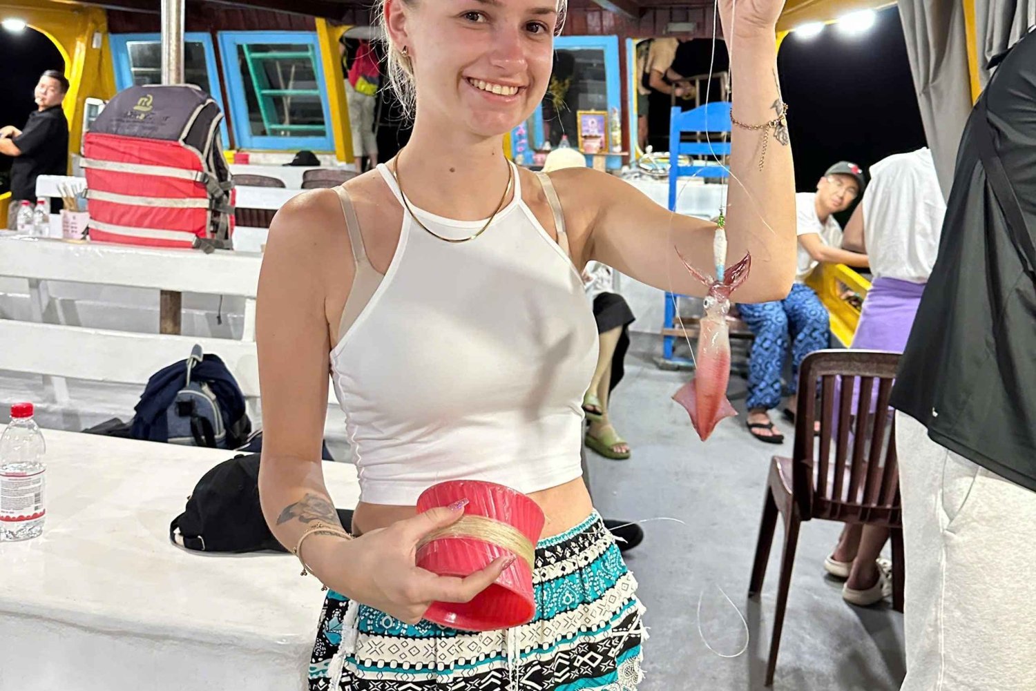 Genieten van de zonsondergang en 's nachts inktvisvissen is een favoriete activiteit in Phu Quoc. Als de zon onder is, is het de beste tijd om van de zonsondergang te genieten. De oceaan wordt donkeroranje en het avontuur begint. Het is tijd om het spannende moment te beleven met nachtelijke inktvisvisactiviteiten. Om 17:00 uur word je bij het hotel opgehaald en begint de reis. Geniet van de zonsondergang midden op zee. Ervaar het vissen op inktvissen. Dineer aan boord en geniet van de verse inktvis die je hebt gevangen. 09:00 Terugkeer naar de haven van Bach Dang en transfer terug naar je hotel. LET OP: De vislocatie kan tijdens het regenseizoen (van april tot oktober) worden verplaatst naar An Thoi. Het weer in het regenseizoen kan bewolkt zijn. DINER MENU: 1 Gestoomde garnalen of gestoomde inktvis. 2 Inktvispap. 3 Roergebakken noedel. 4 Vers fruit. Er geldt een toeslag voor ophaal- en terugbrengservice buiten Duong Dong, neem contact met ons op voor meer informatie! Een toeslag van 20% is van toepassing als je deelnamedatum op publieke Tet feestdagen valt (28/01-02/02, 30/04-01/05, 02/09, 01/01), ter plaatse te betalen. * Alle toeslagen moeten contant aan de chauffeur worden betaald.Includes
