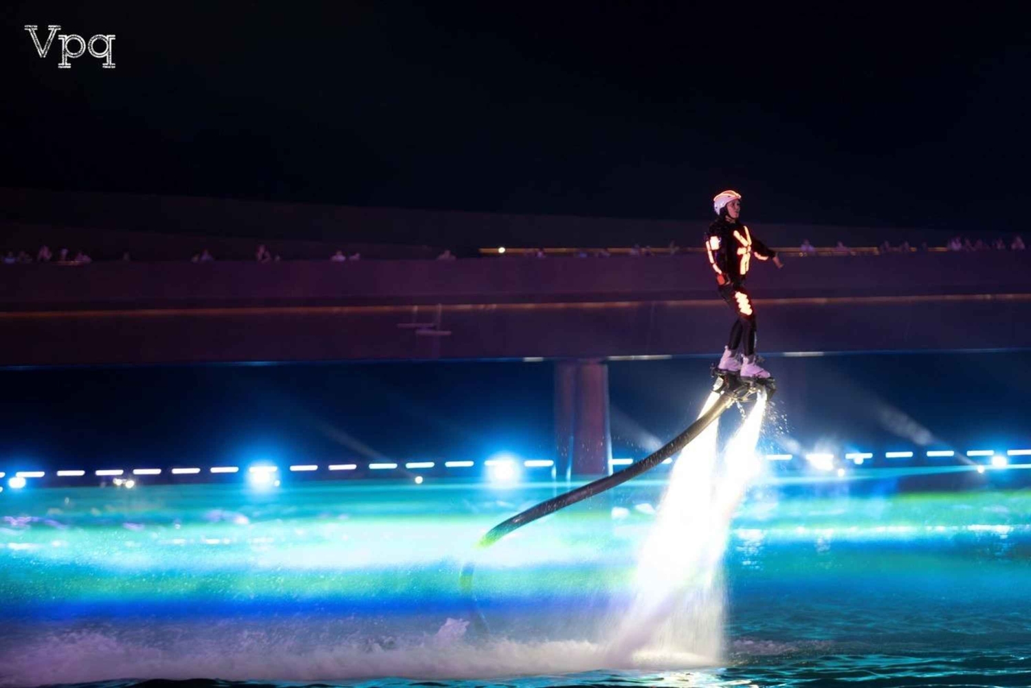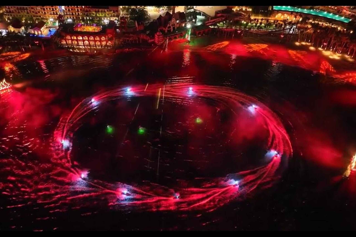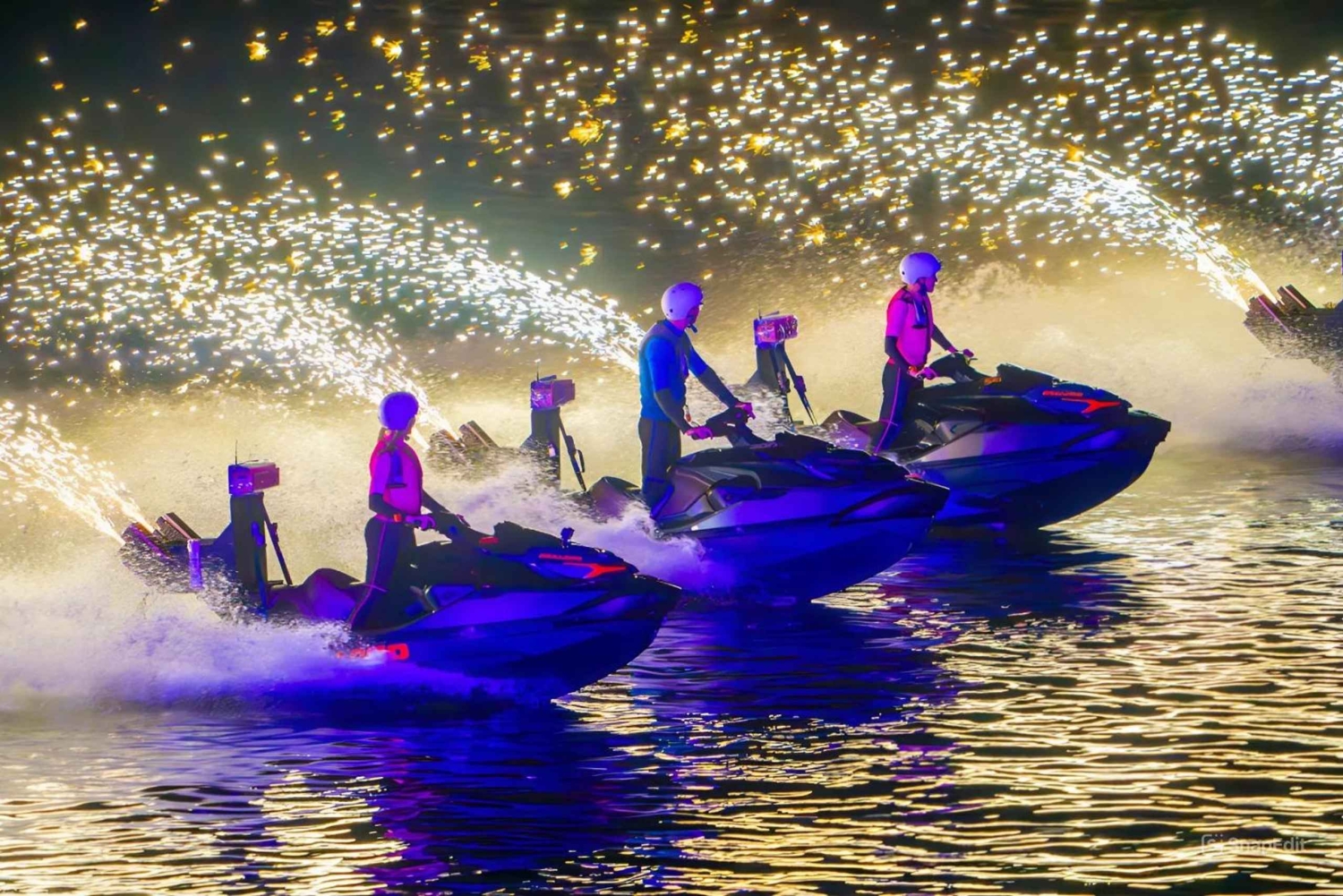 Jetskis rör sig snabbt över vågorna, synkroniserade med musik och färgglada ljus.
