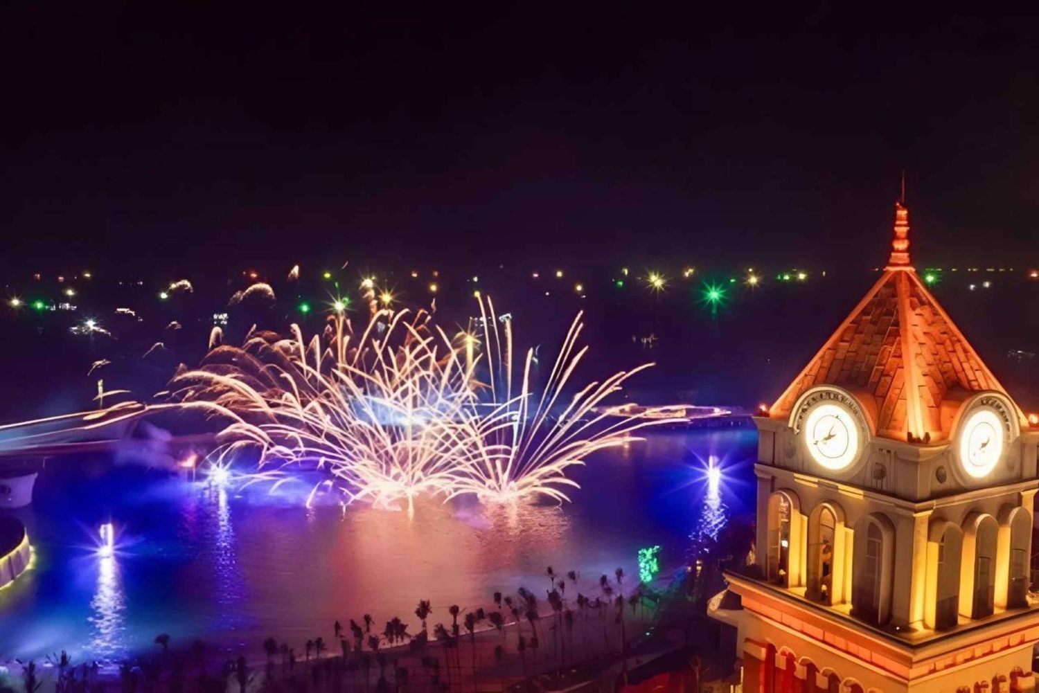 Fyrverkerier lyser upp himlen, reflekteras vackert på havet och skapar en magisk atmosfär.
