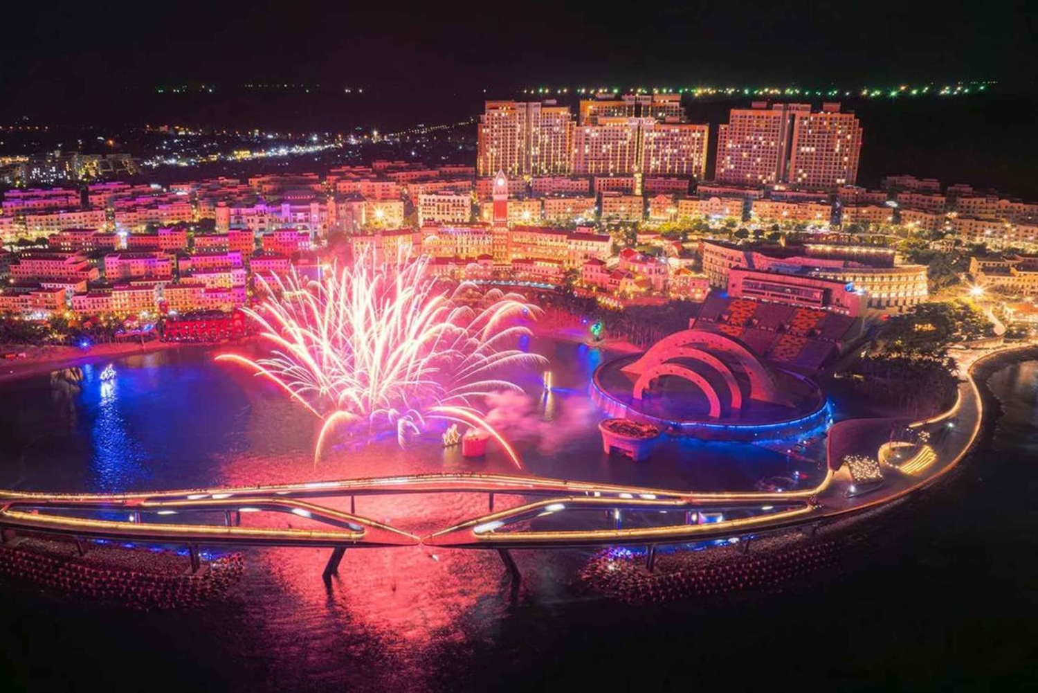 När kvällen kommer i Phu Quoc lyser Kiss of the Sea upp havet med en oförglömlig kvällsshow. Musik, vatten, ljus och fyrverkerier möts för att skapa en fantastisk scen precis vid havet. Höga fontäner rör sig med musiken, färgglada ljus fyller himlen och ljusa fyrverkerier lyser över vattnet, vilket gör att hela området känns magiskt.