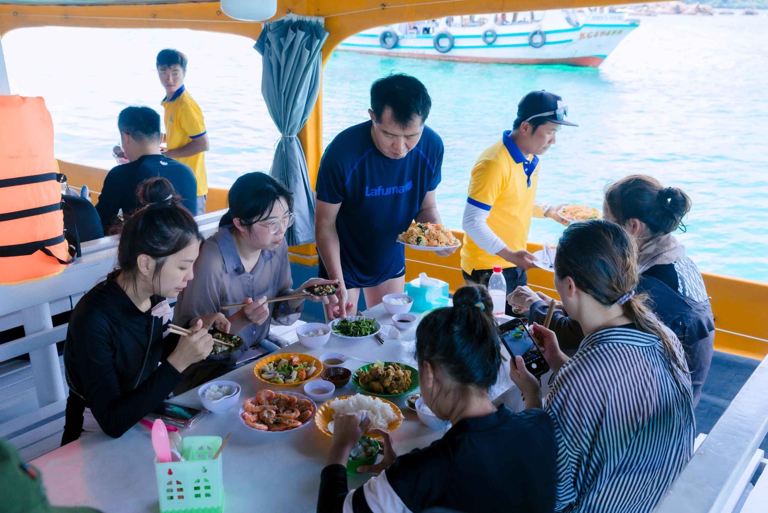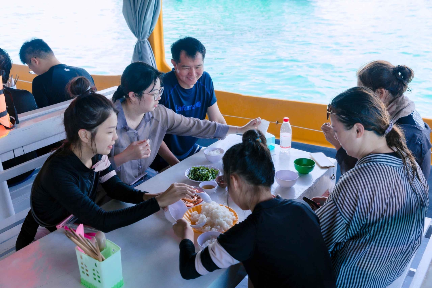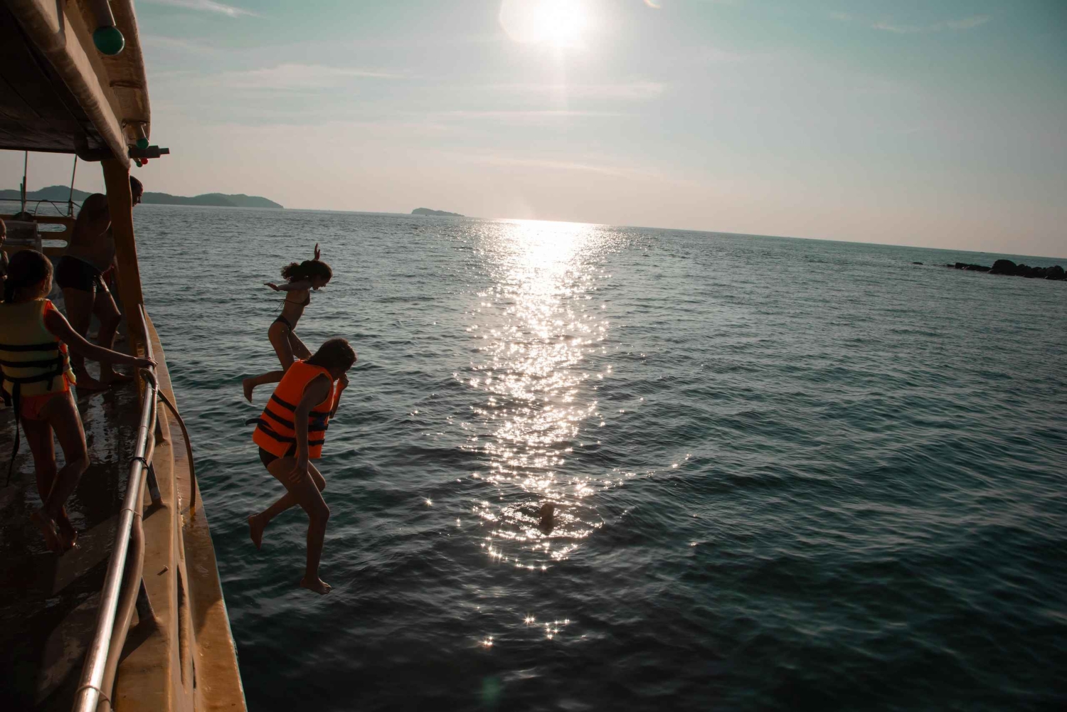 Upptäck Phu Quoc, ett vietnamesiskt paradis, känt för sina tropiska underverk och vackra vita sandstränder. Åk på öluff, se härliga solnedgångar och beundra fantastiska utsikter ombord på en båt. Njut av den exotiska atmosfären på Phu Quocs finaste platser, som Gam Ghi, May Rut Ngoai och May Rut Trong. Ha vattenupplevelser som snorkling och fiske i båten. Sightseeing med världens längsta linbana och Sun World Nature Theme Park. Resplan: 08:00: Du hämtas upp på hotellet och resan börjar. När du väl har gått ombord: ●Havsfiske på 30 minuter. ● Kokosholme – Besök 'Ocean World' Sea sports underhållningscenter. Det finns fler vattensporter på Ocean World för dig att uppleva: Flyboard, jetski och parasailing (självfinansierat). ●Coral Park: Upplev havsvandring (egen finansiering). Stanna vid tre öar i An Thoi-skärgården: ●Sightseeing Gam Ghi islet: Njut av snorkling. ●Ät lunch ombord. ●Sightseeing May Rut Trong islet: chilla och bada i havet. ●Sightseeing med världens längsta linbana och Sun World Nature Theme Park. 17:00: Återvänd till An Thoi-hamnen och ta dig tillbaka till ditt hotell. Lunchmeny: 1. Ångkokta räkor. 2. Sötsur stekt bläckfisk. 3. Stekt eller bräserad fisk. 4. Wokad kyckling med citrongräs och chili. 5. Wokade nudlar med grönsaker. 6. Wokad morning glory med vitlök. 7. Stekta ägg. 8. Ångkokt ris. 9. Färsk frukt. Förbud och begränsningar ●Denna aktivitet rekommenderas inte för personer med vissa medicinska tillstånd som högt blodtryck, epilepsi, etc. ●En tilläggsavgift på 20 % tillkommer om ditt deltagandedatum är på offentliga Tet-helgdagar (01/01, 16/02 -21/02, 30/04, 01/05, 02/09), som betalas på plats.Includes